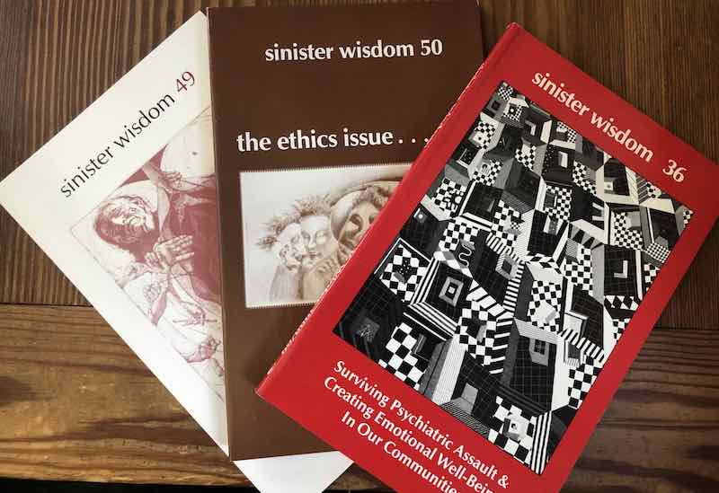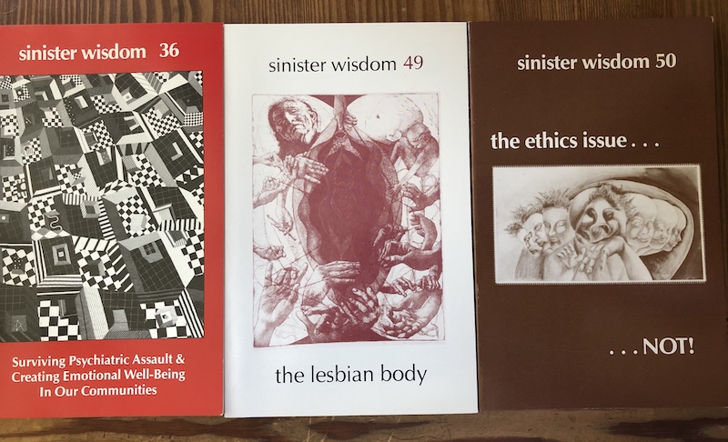 Sinister Wisdom is offering the package at three rates with our usual sliding scale: $4.00 which covers the cost of postage only, $10.00 which covers postage and a small contribution to Sinister Wisdom to help us keep doing our work, $15 is for womyn who can give a little more to Sinister Wisdom and cover the cost of the issues and postage. Make your selection below and I'll post these issues to you without delay. Order a set for you--and a set to share with a friend. We need lesbian words and ideas now more than ever to resist Trump and this era of US politics.